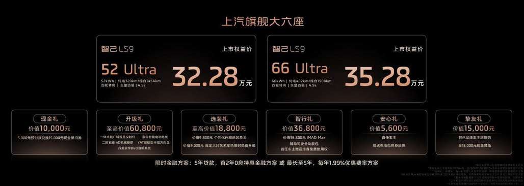 更震撼的是,智己LS9上市权益诚意爆棚,将奢华B&O音响系统、二排右侧4D机械按摩、一体式超广域智慧探射灯、豪华智能电动踏板等旗舰豪华配置,统统限时免费升级!新车震撼发布两个超级增程版本:智己LS9 52 Ultra版上市权益价32.28万元,入门即巅峰,以30万出头的价格,享受时代最旗舰的满配大六座;智己LS9 66 Ultra版,更搭载66度宁德时代超级骁遥MAX电池,将续航和性能推向极致,上市权益价35.28万元,一锤定音30万级最强旗舰爆品。