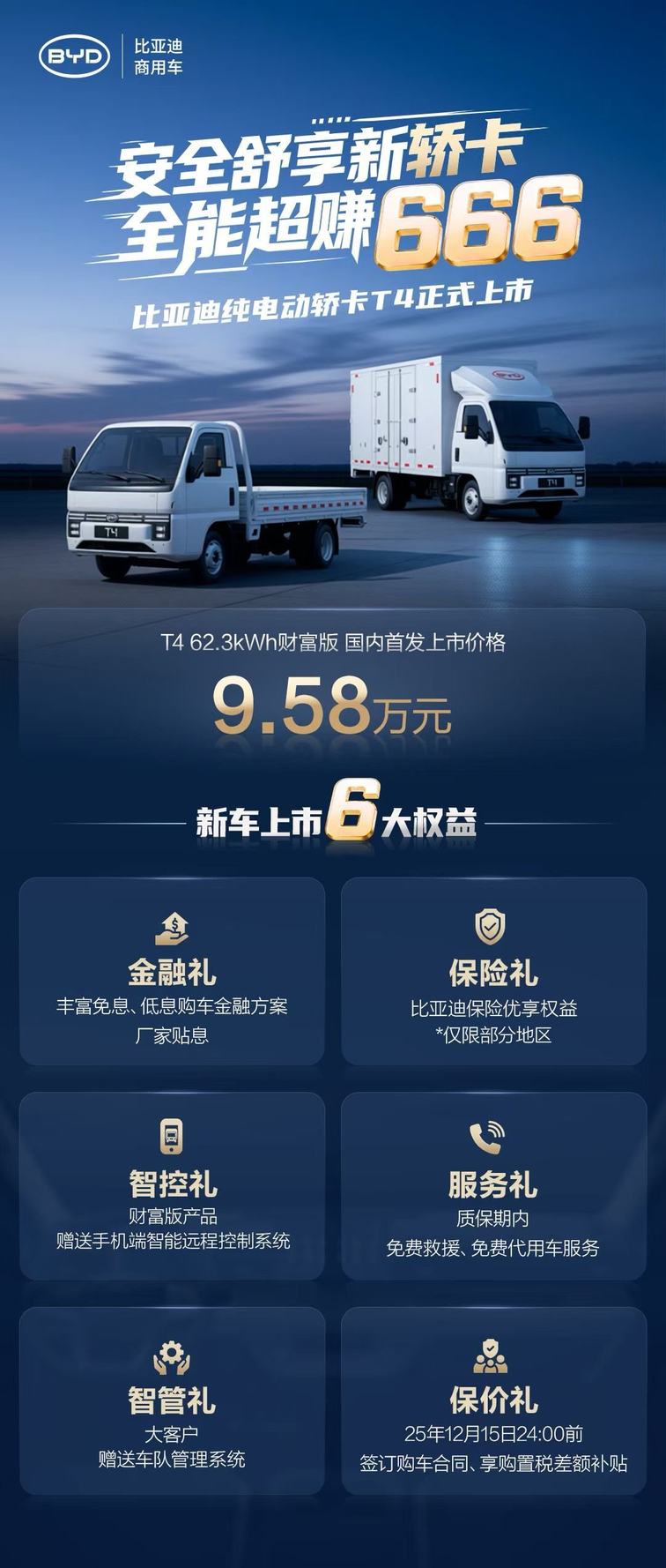11月13日,纯电轿卡T4迎来全球首发。这款承载比亚迪“用技术创新满足美好生活向往”理念的新品,以“乘商同源”基因重新定义轿卡价值。让物流从业者既能“多拉快跑”,又能拥有轿车般的舒适与体面。其62.3kWh 财富版售价为9.58万元,让国内用户以亲民成本享受国际高端品质。