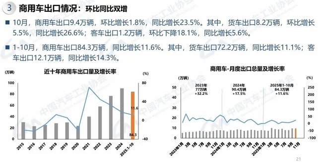 2025年1-10月,商用车国内销量263.6万辆,同比增长8.3%。其中货车国内销量230万辆,同比增长7.7%;客车国内销量33.6万辆,同比增长12.5%。商用车出口84.3万辆,同比增长11.6%。其中货车出口72.2万辆,同比增长11.1%;客车出口12.1万辆,同比增长14.3%。