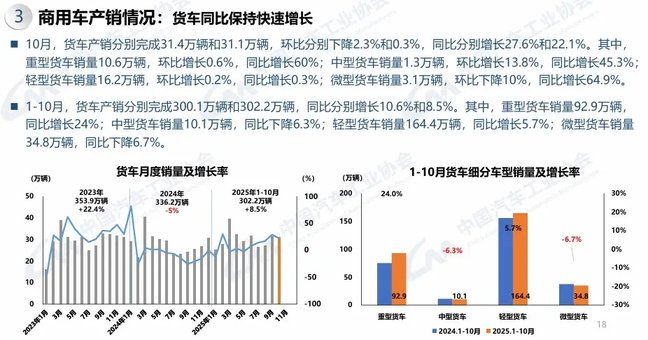 其中货车产销分别完成300.1万辆和302.2万辆,同比分别增长10.6%和8.5%。分品类来看,2025年1-10月,重型货车销量92.9万辆,同比增长24%;中型货车销量10.1万辆,同比下降6.3%;轻型货车销量164.4万辆,同比增长5.7%;微型货车销量34.8万辆,同比下降6.7%。