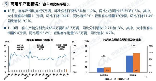 客车产销分别完成45.4万辆和45.7万辆,同比分别增长12.7%和13%。分品类来看,2025年1-10月,大中型客车销量9.4万辆,同比增长6.8%;轻型客车销量36.3万辆,同比增长14.7%。