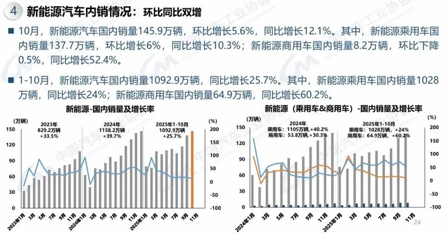 2025年10月,新能源汽车国内销量占汽车国内销量比例为54.9%;其中新能源商用车国内销量占商用车国内销量比例为30.9%。2025年1-10月,新能源汽车国内销量占汽车国内销量比例为49.5%;其中新能源商用车国内销量占商用车国内销量比例为24.6%。