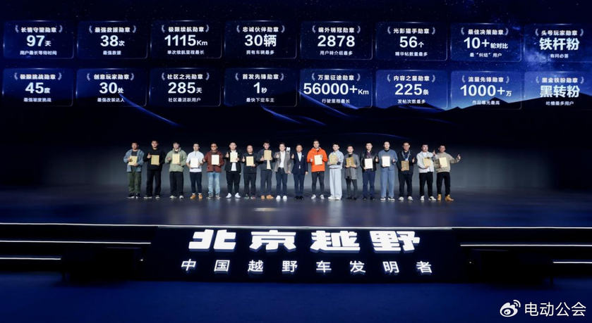 北汽集团董事长张建勇为BJ40增程“车主之最”用户颁奖。16位获奖用户包括等车时间最久用户、行驶里程最长用户、一箱油单次跑出最远里程用户等,他们用一个个动人的故事,让BJ40增程不仅仅是一台车,更成为一种文化,一种精神符号。