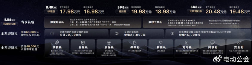 自此,BJ40增程家族一共拥有标准版、进阶版、元境智行版三个版型。北京越野还带来了BJ40增程三个版型均能享受的两大全系迎新礼。
