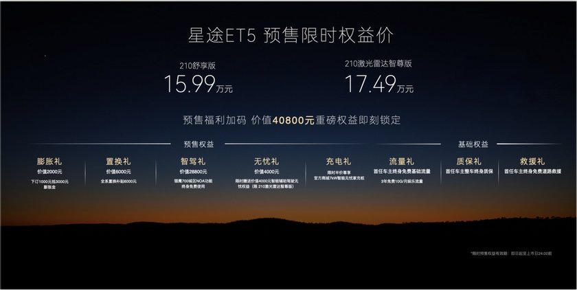 预售期间,星途ET5为下定用户准备了总价值高达40800元的重磅福利,多项预售专属礼遇现已开启:下订1000元可抵3000元购车款、全系6000元置换补贴、价值28800元的猎鹰700辅助驾驶功能终身免费、专属4000元智能辅助驾驶无忧权益限时赠送(限210激光雷达智尊版)以及官方商城7kW智能家充桩半价尊享。同时,星途还为首任车主提供三大基础权益,包括终身免费基础流量,3年10G/月娱乐流量、整车终身质保及终身免费道路救援服务,以满格诚意打造预售期用户的尊享购车体验。