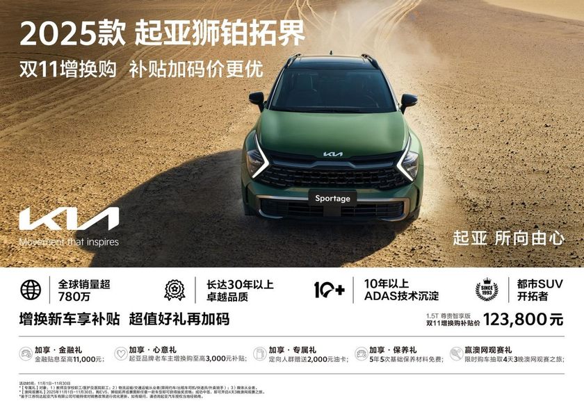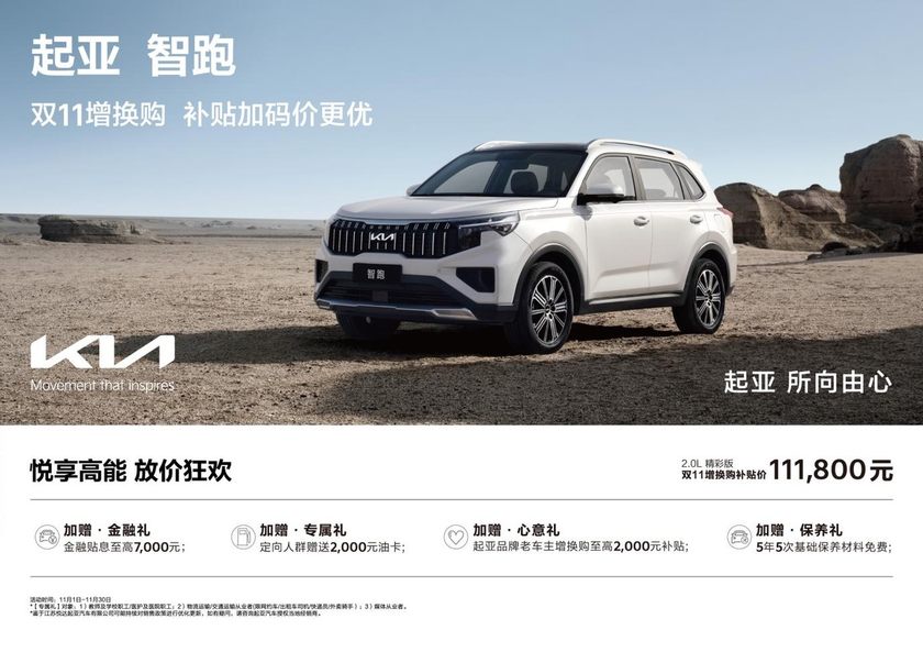 11月30日前购买新车的用户,可享“双11大促价+双11增换购补贴价”组合权益,以官方指导价189,800元1.5T尊贵智享版为例,双11增换购补贴价仅需123,800元。此外,消费者购车还可享金融贴息至高11,000元、起亚品牌老车主增换购至高3,000元补贴、定向人群赠送2,000元油卡、5年5次基础保养材料免费,以及限时购车抽取4天3晚澳网观赛之旅等专享权益。