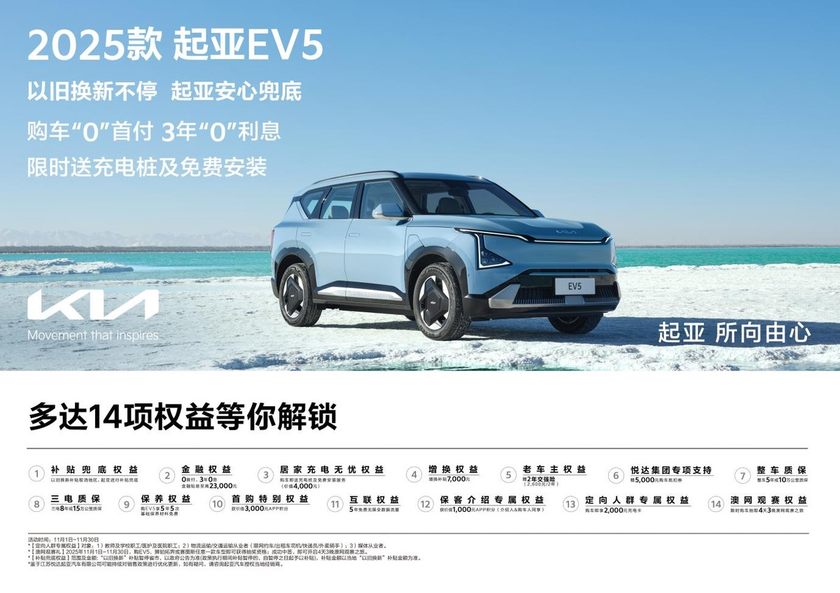 EV5是起亚首款在中国首发、中国生产并销往全球的战略车型。2025款EV5起售价14.98万元,新车不仅增配不加价,还可享至高14项超值购车权益,包括以旧换新补贴取消地区,补贴兜底权益、3年0首付0息(金融贴息至高23,000元)、赠送充电桩及免费安装服务(价值4,000元)、7,000元增换购补贴、起亚老车主购车赠2年交强险(2,600元/2年)、悦达集团5,000元购车抵扣券、整车5年或10万公里质保、三电8年或15万公里质保、5年5次基础保养材料免费、价值3,000元APP积分首购特别权益、5年免费无限全数据流量、保客介绍专属权益可获1,000元APP积分(介绍人&购车人同享)、定向人群购车即享2,000元充电卡等优惠,以及限时购车抽取4天3晚澳网观赛之旅。