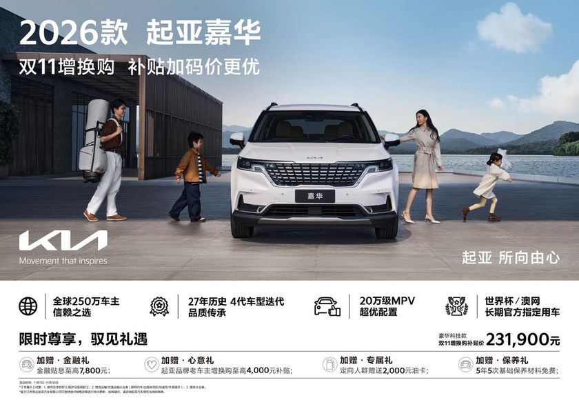 即日起至11月30日,消费者购买2026款起亚嘉华可享“双11大促价+双11增换购补贴价”组合权益,豪华科技款综合优惠后,双11增换购补贴价仅需231,900元。同时,购车还可享金融贴息至高7,800元、起亚品牌老车主增换购至高4,000元补贴、定向人群赠送2,000元油卡、5年5次基础保养材料免费等多项超值权益。