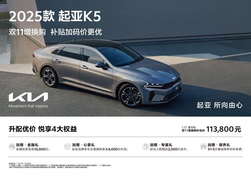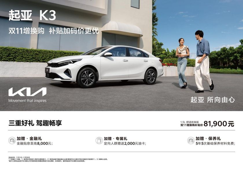 与此同时,消费者购买起亚新K3、索奈同样可享“双11大促价+双11增换购补贴价”组合权益,以及金融贴息、2,000元油卡、基础保养材料免费等权益。而2025款起亚K5、智跑则在上述购车权益基础上,分别增加4,000元和2,000元的起亚品牌老车主增换购补贴权益。