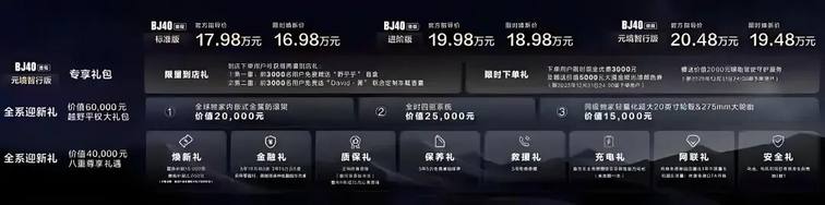 BJ40增程元境智行版的到来,让硬派增程SUV家族阵容更为完整,目前全系已涵盖标准版、进阶版、元境智行版三款版型。其中,元境智行版官方指导价20.48万元,叠加国补与厂端置换后的限时焕新价仅19.48万元,让硬核越野体验触手可及。更具诚意的是,三款版型均享有两大全系迎新礼:价值六万元的越野平权大礼包,包含全球独家内嵌式金属防滚架、全时四驱系统及同级独家轻量化20英寸轮毂与275mm大轮胎,全部免费标配;价值四万元的八重尊享礼遇更是覆盖购车、用车全周期,从置换增购补贴、灵活金融方案,到三电终身质保、5年免费基础保养,再到首任车主免费充电桩、终身免费基础流量等,全方位降低用户购车门槛与用车成本。