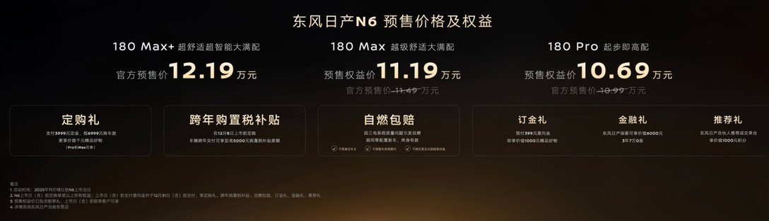 当然,还有日产全球首款插混轿车N6同步开启预售,价格区间10.99万元~12.19万元,预售权益价10.69万元起,新车将于12月8日上市。