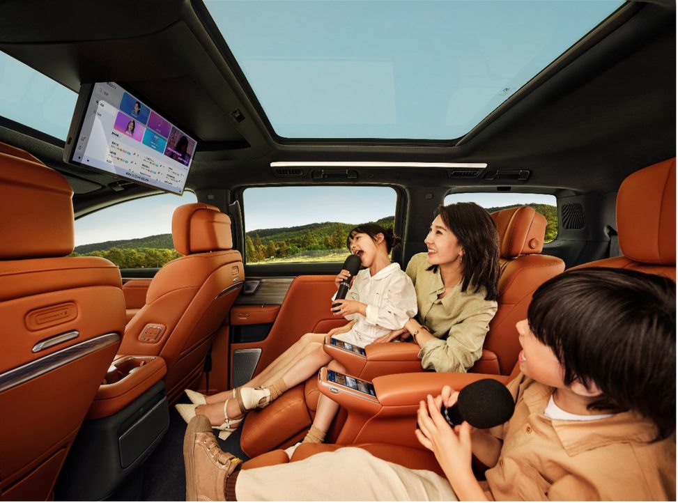 宽适空间之上,至境世家更以8屏空间生态互联,构建全家沉浸式娱乐厅。至境世家搭载高通最新SA8775P芯片,其高达72TOPS的AI算力为行业领先的8屏数字空间提供了强大支持。座舱内不仅有50吋全景AR-HUD抬头显示,还配备了10.25吋仪表屏、16.3吋中控屏、16.3吋副驾屏和21吋4K后舱多媒体智慧屏。屏幕均达到200PPI视网膜级细腻画质,并通过了莱茵TUV低蓝光护眼认证,呵护全家视力健康。后舱娱乐屏支持连接蓝牙麦克风和游戏手柄,配合Bose悦享音响系统,瞬间化身移动的KTV与游戏室。同级唯一的两个5.5吋智慧移动管家屏,则让二排乘客对舒适功能一屏掌控。此外,至境世家还配备二排OMS摄像头,支持手势控车和乘员实时检测,为宝宝睡眠或宠物留车等场景提供更贴心的呵护。AI大模型语音助手可控制超过700项车控功能,并提供情绪陪聊和AI绘画等服务,让移动的家更有温度。