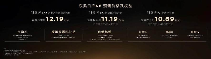 本次预售,东风日产N6推出180Pro、180Max、180Max+三个版本。起步即高配,N6全系标配:20度以上大电池、180公里纯电长续航。