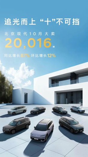 11月1日,北京现代官方平台发布宣传海报称,公司10月大卖20016辆车,同比增长87%,环比增长12%。同时,北京现代用《追光而上,“十”不可挡!》来描述销量表现,似乎取得了了不起的成绩。不过,月销两万辆对于以往的北京现代而言,可谓不值一提。