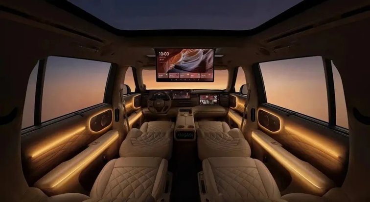内饰采用乳白色+灰色配色方案,辅以金色缝线和镀铬饰条装饰,营造出高端商务气质。中控台由仪表盘与中控屏组成的一体式大屏,搭配15.6英寸3K副驾驶屏和22.5英寸2K后排吸顶屏,形成多屏交互的科技布局。舒适性方面,LS9配备三把零重力座椅,支持贵妃椅、大床房等多种模式切换。