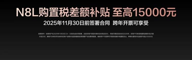腾势N8L售价为29.98万元-32.98万元,上市以来持续热销,为回馈用户厚爱,推出限时购车权益,价值至高达10.67万元!包括价值1.7万元的三年免息,最高1万元的置换补贴。此外,在2025年11月30日24点前完成合同签署的用户,如果因非用户原因车辆未及时交付,导致开票实际发生在2026年,可享受购置税差额补贴,最高1.5万元!用户不必担心因为交车晚,而享受不到购置税补贴。