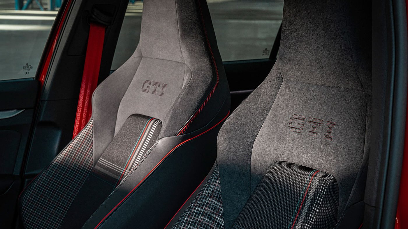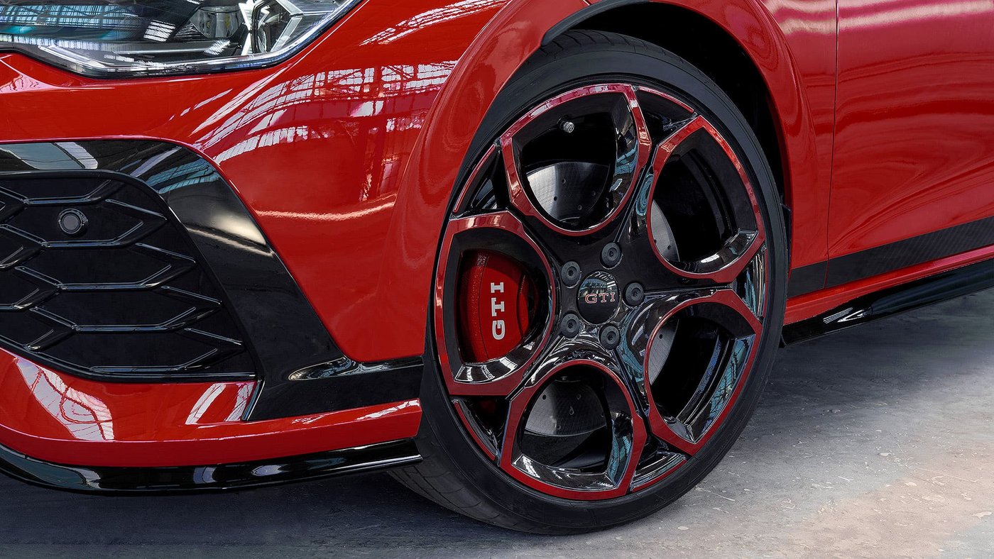 外观设计上,高尔夫GTI 50周年纪念版拥有多项专属设计元素。进气格栅上,LED灯带与GTI标志性的红色饰条相结合;中央的“大众”标志采用暗色处理,并辅以细致的光带轮廓。未选装Performance套件的车型配备红色点缀的19英寸Queenstown轮圈。亮点之一是静态中轴盖设计——即使车轮转动,标志依旧保持水平。