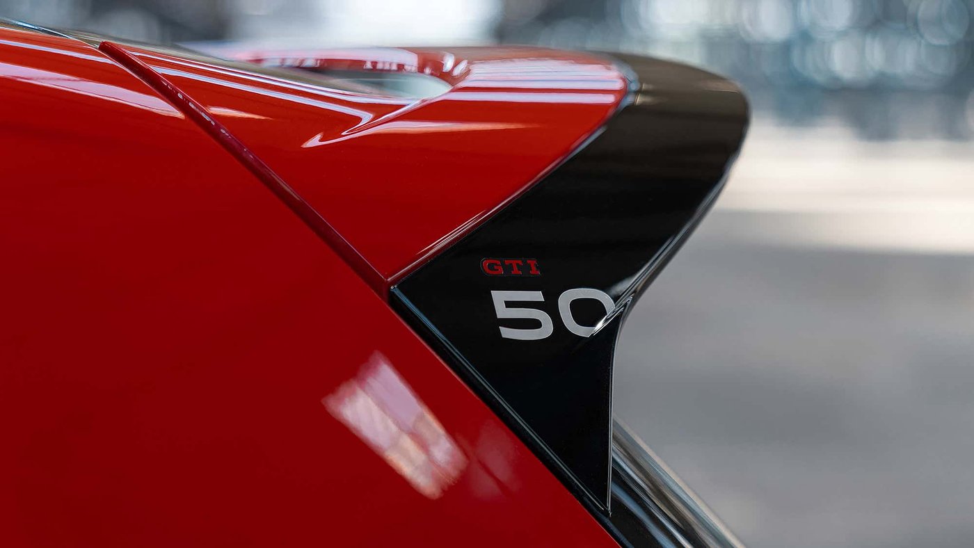 尾翼、后视镜内侧印有GTI 50标志;车顶与后视镜外壳为黑色,并辅以从黑到红的渐变侧条纹,强化视觉冲击。