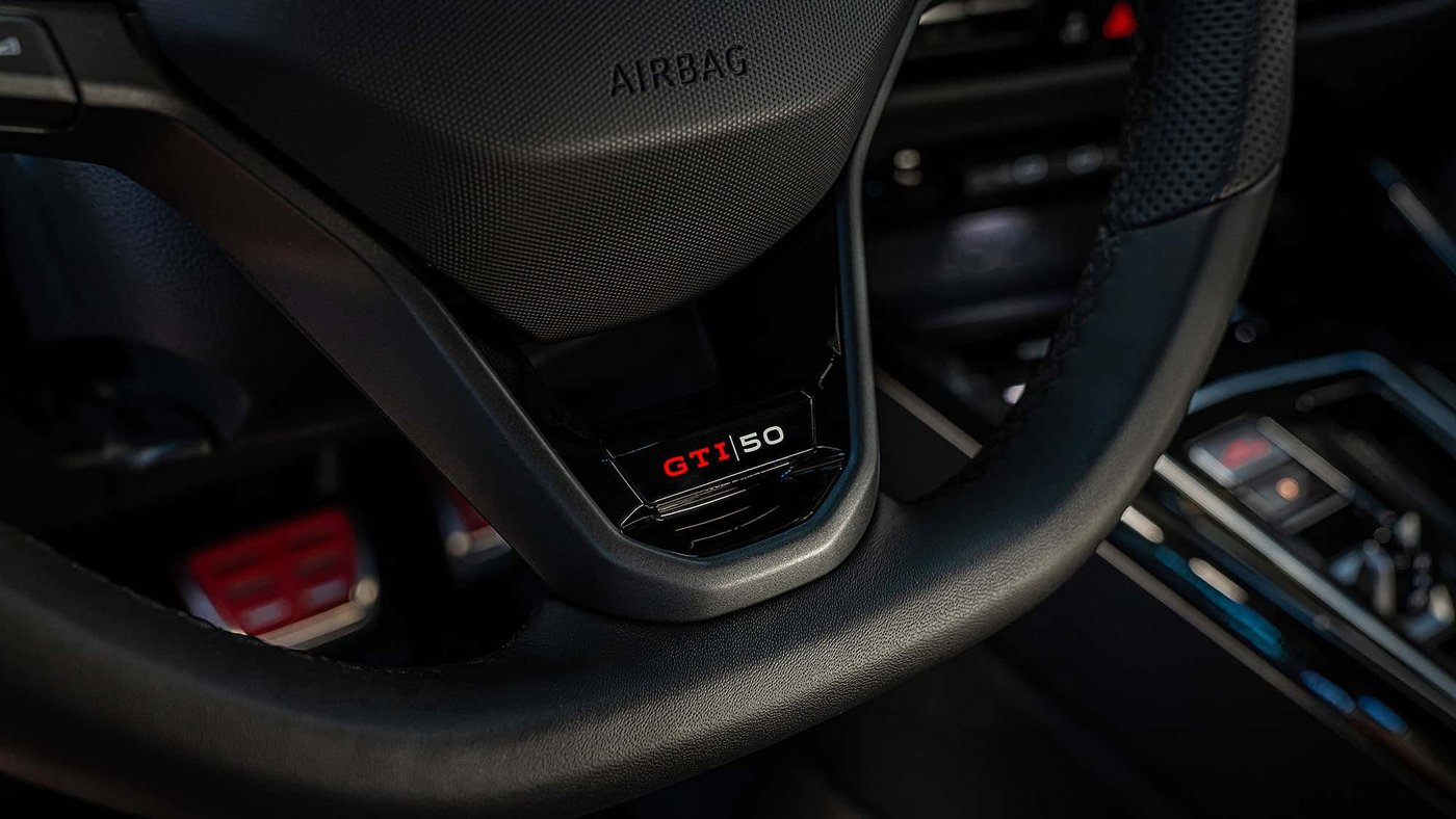内饰设计上,50周年纪念版座舱内采用经典的格纹运动座椅,并集成头枕。真皮运动方向盘带换挡拨片,并饰有GTI 50徽章与深色铝饰板。门把手同样使用深色铝材、脚垫缝有GTI标志、迎宾踏板印有“Edition 50”字样、车钥匙上也刻有GTI 50徽标、踏板橡胶垫采用红银双色设计,细节满满。