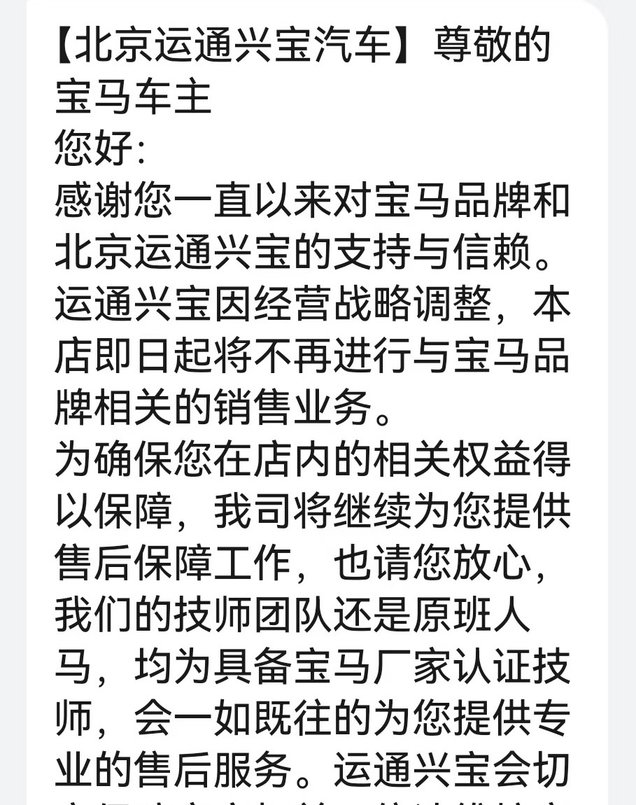 近日,北京一家宝马4S店向客户发出这样一条通知短信。尽管店家声称“售后保养维修服务照常进行”,但联想到此前一些门店“爆雷”的先例,不少车主心里还是咯噔一下:“店里赠送的权益不会是要泡汤吧?”