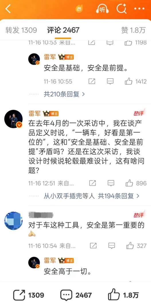 11月16日,雷军突然连发三条微博重申自己对汽车安全与设计的理解。他先是汇总了自己在小米SU7发布前关于安全认知及研发标准的多条旧微博,随后又在转发时补充发布时间,并在原博评论区追加数条回复。