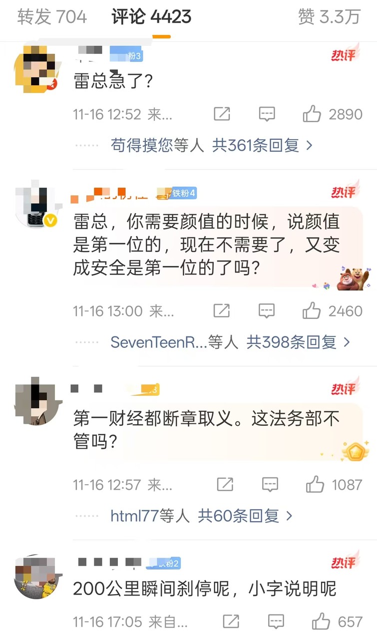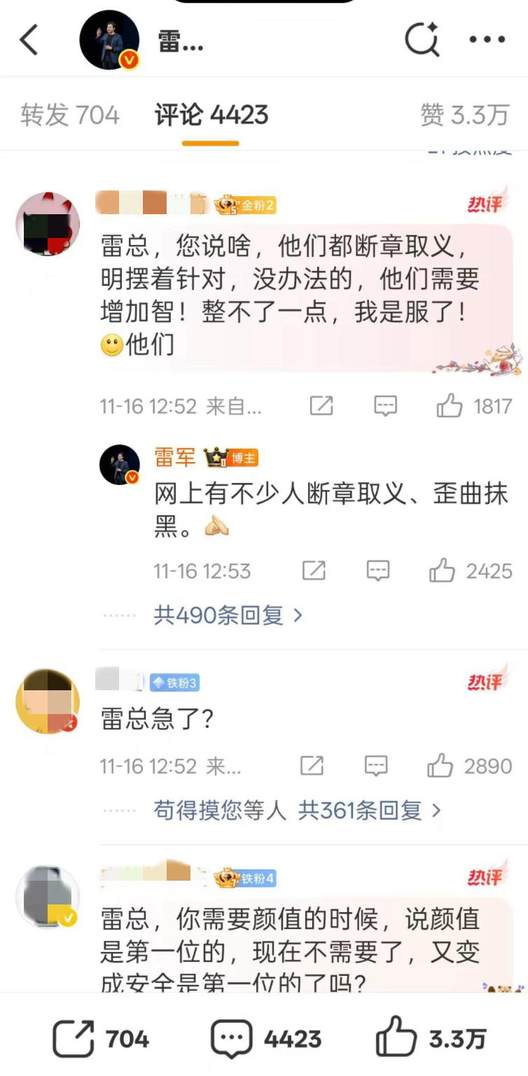 从截图中的文字能够看出,雷军这次回应非常严肃认真,没有太多感性化表达,连续反问的语气,似乎也让我们能感受到他这次似乎真的是“动了气”。
