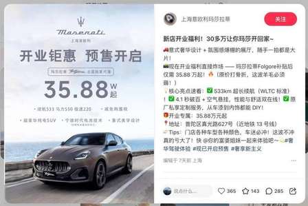 根据部分媒体爆料,此次骨折价的车型均为新店开业的特批现车资源,七八十台特价车目前已售出半数,甚至出现了外地客户跨城订购的情况,可见降价确实带来了一波销售热潮。然而,这波热潮更像是清仓回血的无奈之举。值得一提的是,此次骨折价销售并非玛莎拉蒂官方主导,活动车型主要是老款车型,目的是清库存、回笼资金。另外,35.88万仅为基础裸车价,需额外支付其他选配费用,最终落地价约40万元。