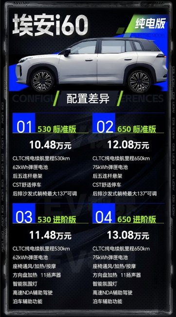在A级纯电SUV市场,埃安i60没玩“低价减配”的套路。10.48万元的起售价,却给了B级车的空间、豪车级的底盘、长续航的电池、满配的安全。它不是“预算有限的将就之选”,是“懂生活的优选之项”。