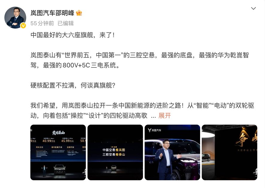 岚图泰山37.99万起售 !邵明峰说中国最好的大六座旗舰来了