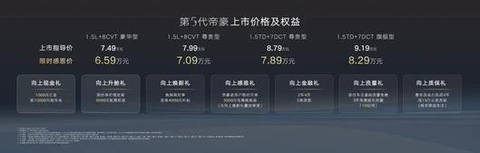 11月18日,第5代帝豪在杭州正式上市,新车推出两种动力四款车型,官方指导价7.49万元-9.19万元万元,限时感恩价6.59万元-8.29万元,同时,11月30日前购车,还有7重好礼可享。