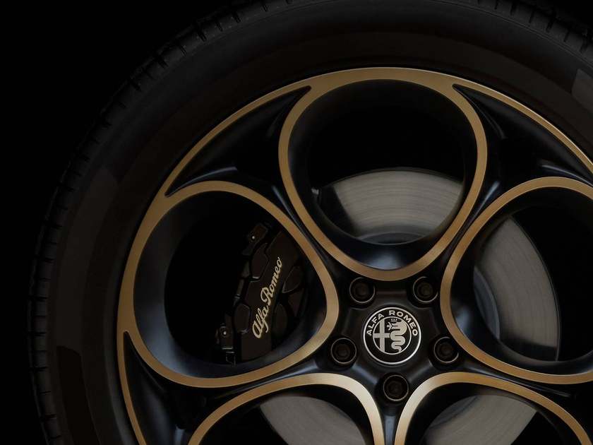 源于传奇超跑33 Stradale的设计,19英寸双色钻石切割合金轮毂,带金色哑光饰面,以及饰有金色细节的黑色制动卡钳