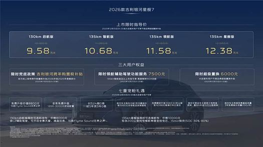 11月19日,2026款吉利银河星舰7 EM-i正式上市,四个版本的上市限时指导价定在9.58-12.38万元之间。这个定价策略立刻在汽车行业内引起了广泛关注,不仅因为它直接将主流插电混动SUV拉入了10万元区间,更因为它所呈现的技术配置正在重新定义这个细分市场的竞争规则。