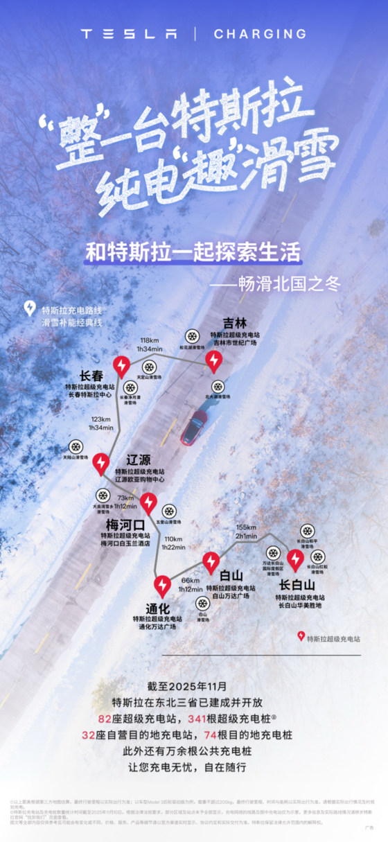 值得注意的是,特斯拉近日还在东北三省内推出了“整一台特斯拉,纯电趣玩冰雪季”系列主题自驾路线,目前已发布“冬季滑雪特色路线——畅滑北国之冬”从吉林出发,一路驶向长白山,带着滑雪板,来一场说走就走的纯电旅行。