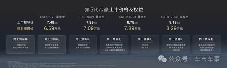第5代帝豪此番全球上市,不仅推出6.59万-8.29万元的亲民价,还送七重豪礼。