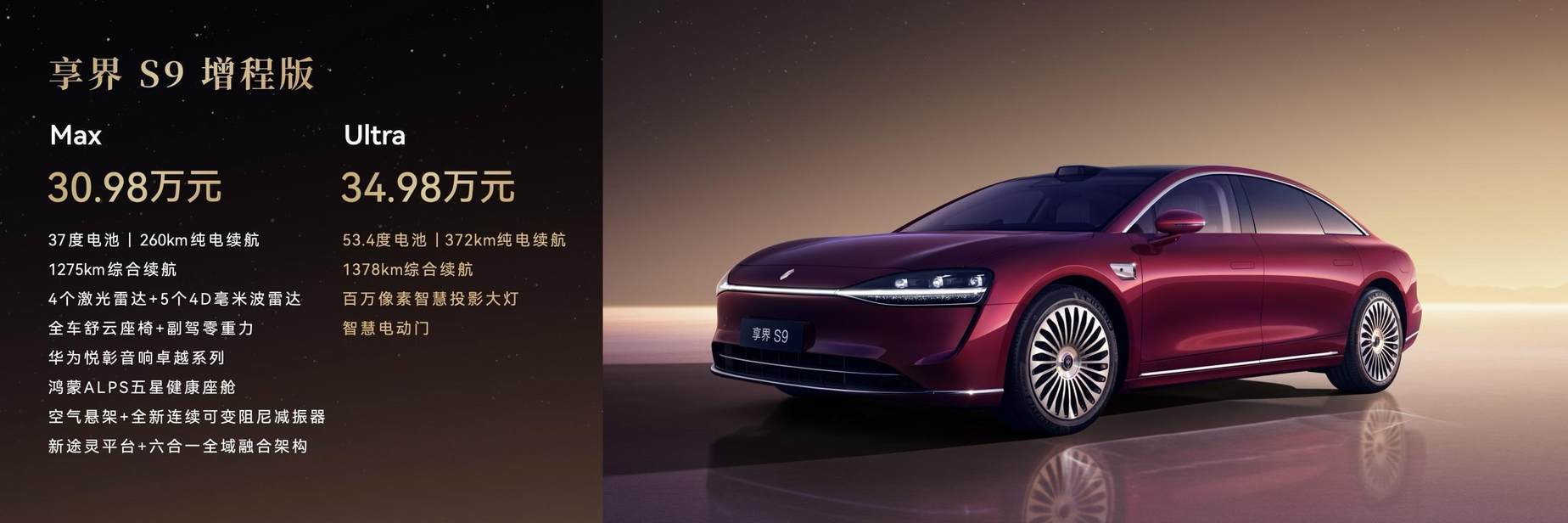 2025年11月20日,在鸿蒙智行 享界S9新品发布会上,旗舰9系享界S9正式上市。作为鸿蒙智行年度压轴新品,新款享界S9全面搭载华为旗舰顶配科技,豪华之上悦启新境。升级搭载全新华为途灵平台、华为乾崑智驾ADS 4、全新智慧电动门、全新星云尾灯、鸿蒙ALPS健康座舱、后排零重力座椅、华为百万像素智慧投影大灯、华为悦彰音响卓越系列等,以越境的豪华、智慧、性能、安全体验,全面满足用户商务社交、家庭出行、城市休闲等场景,实现更瞩目、更从容、更悦享的出行体验,引领豪华轿车价值跃迁。
