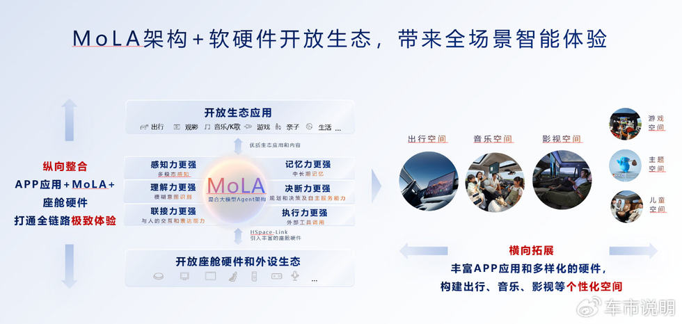 作为 HarmonySpace 5 起采用的核心架构,MoLA 通过融合多模态感知、通用大模型与垂域智能体,搭建起从用户意图到硬件执行的完整链路。其独创的全域免唤醒、导航三模式纠错等功能,让语音交互告别指令束缚。用户说 “车里有点暗” 即可开启阅读灯,导航时可随时改口调整目的地,彻底实现口语化控车。