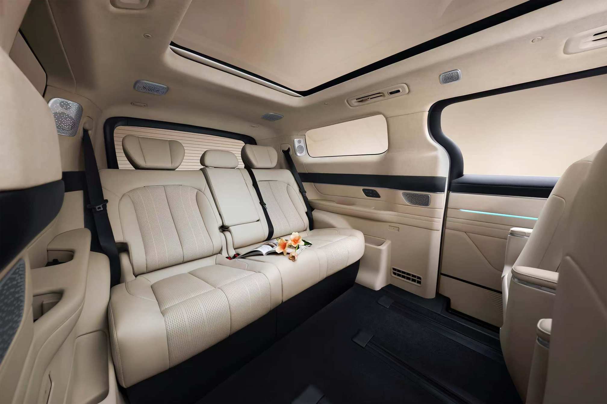 内饰方面,银河 V900 构建了旗舰级的奢适格局。温暖柔和的舱内色彩营造出自然舒适的氛围,超大面积全景天幕延伸至第三排上方,让整车视野更加开阔通透。二排座椅宽大舒适,尽显尊贵感;三排空间充裕,彻底打破了传统 MPV 三排局促的刻板印象,确保每位乘客都能获得舒适的乘坐体验。此外,二排小桌板拓展了移动办公、会客等使用场景,细节处的储物空间设计,更体现出对用户需求的细致考量。