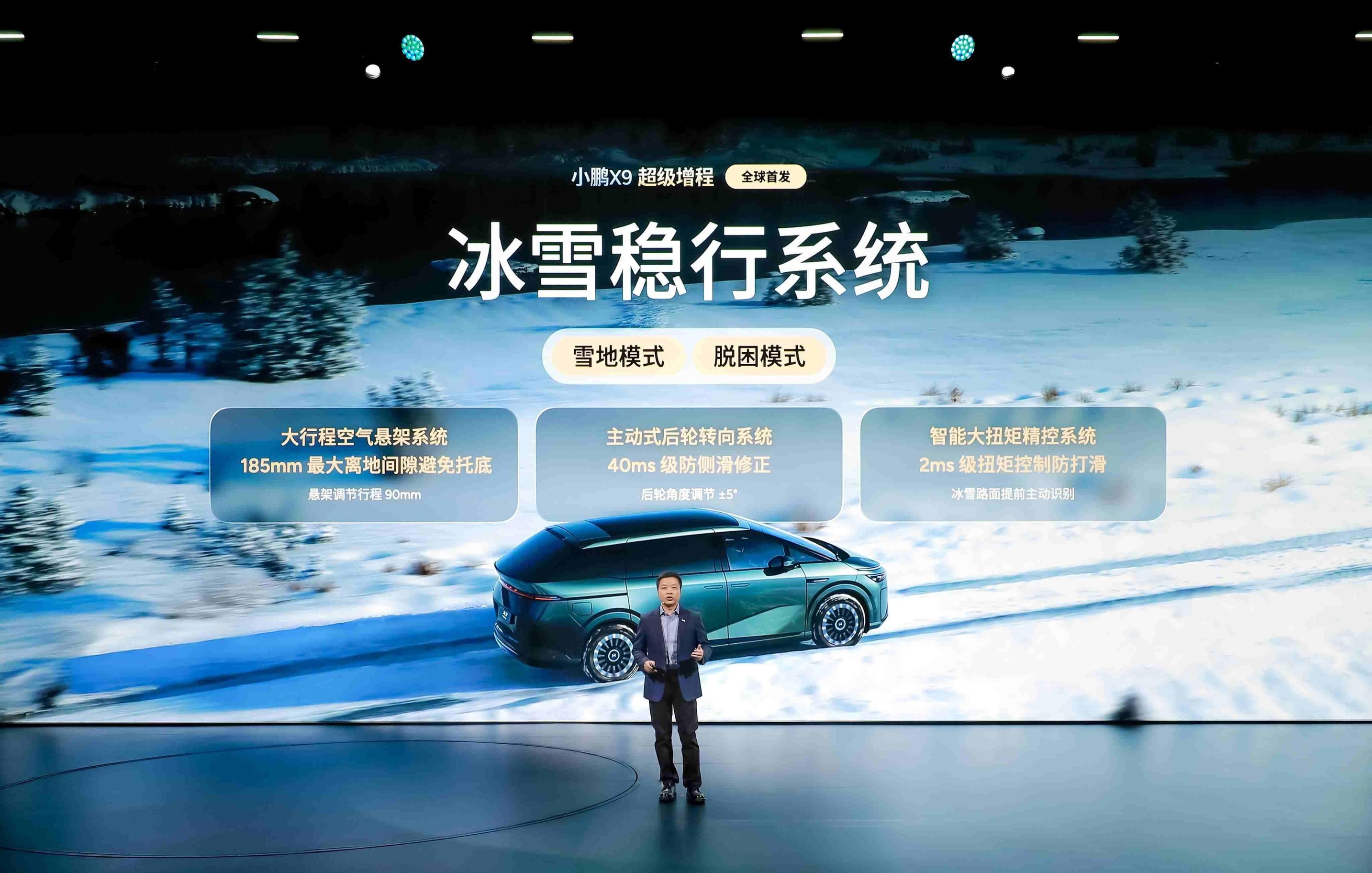 小鹏X9超级增程的主动安全同样成为行业标杆。新车具备全场景极限爆胎不失控能力,在160km/h积水路面、150km/h暴雨天气等极端工况下即使爆胎依然能稳定行驶。在面对高速施工/抛锚车等特殊情况时,也能自动紧急避让。新车搭载的AEB与AES系统最高支持130km/h刹停与避让。此外,面对北方用户最关心的冰雪行车,小鹏X9超级增程也能从容应对。其搭载的冰雪稳行系统,带来雪地模式及脱困模式。通过185mm最大离地间隙的大行程空气悬架系统、毫秒级响应的后轮主动转向系统以及智能大扭矩系统的协同配合,小鹏X9超级增程能实现雪地结冰路面不打滑,即使是10cm雪坑后轮陷车,也能顺利脱困。