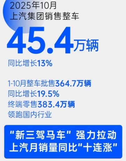 市场销量的反映:10月份销售整车45.4万辆,同比增长13%,在自主品牌、新能源、海外市场“新三驾马车” 强力拉动下,今年以来上汽月销量已实现同比连涨。