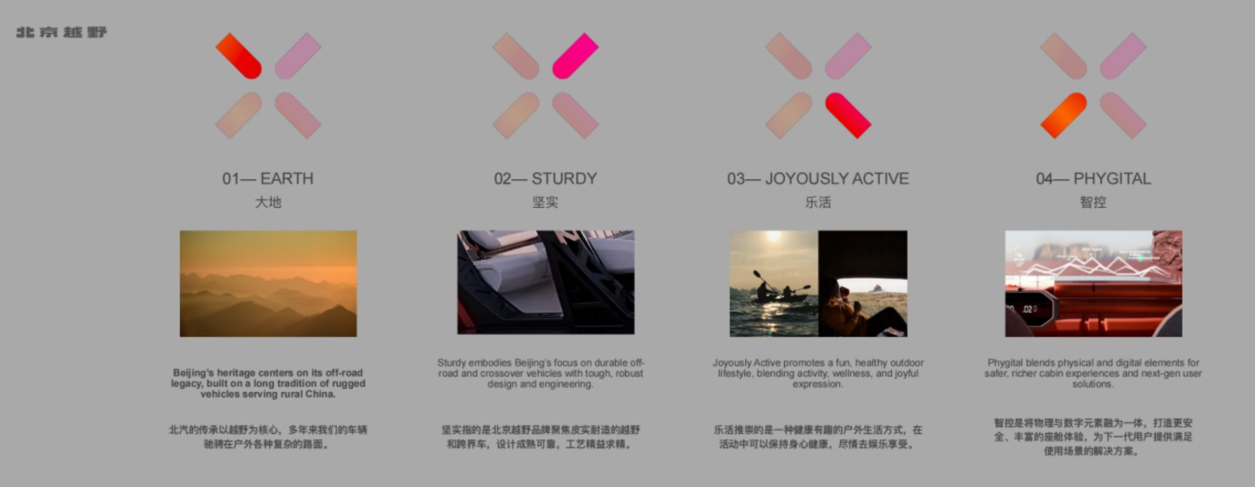 北京越野全新的设计理念命名为“ELEMENTAL”(元素化),建立在四大核心支柱之上,分别是:大地Earth、坚实Sturdy、乐活Joyously Active与智控Phygital。它是一个战略框架,既契合品牌特质,也贴合客户关注的核心——探险、健康与户外生活。从现在起,北京越野将创造性地、持续地将这一理念应用于全系车型。