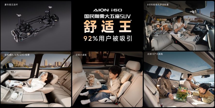 从产品配置来看,埃安i60的大空间、舒适驾乘、安全保障、续航表现和智能体验得到了用户的广泛认可。同级最大的后排,成年人可以轻易找到舒服的坐姿,小孩子也能站直玩耍。同级最大137度放倒的后排座椅,老人久坐也不觉疲惫,前排“满血”座椅支持通风、加热、按摩,长时间驾驶也能一身轻松。