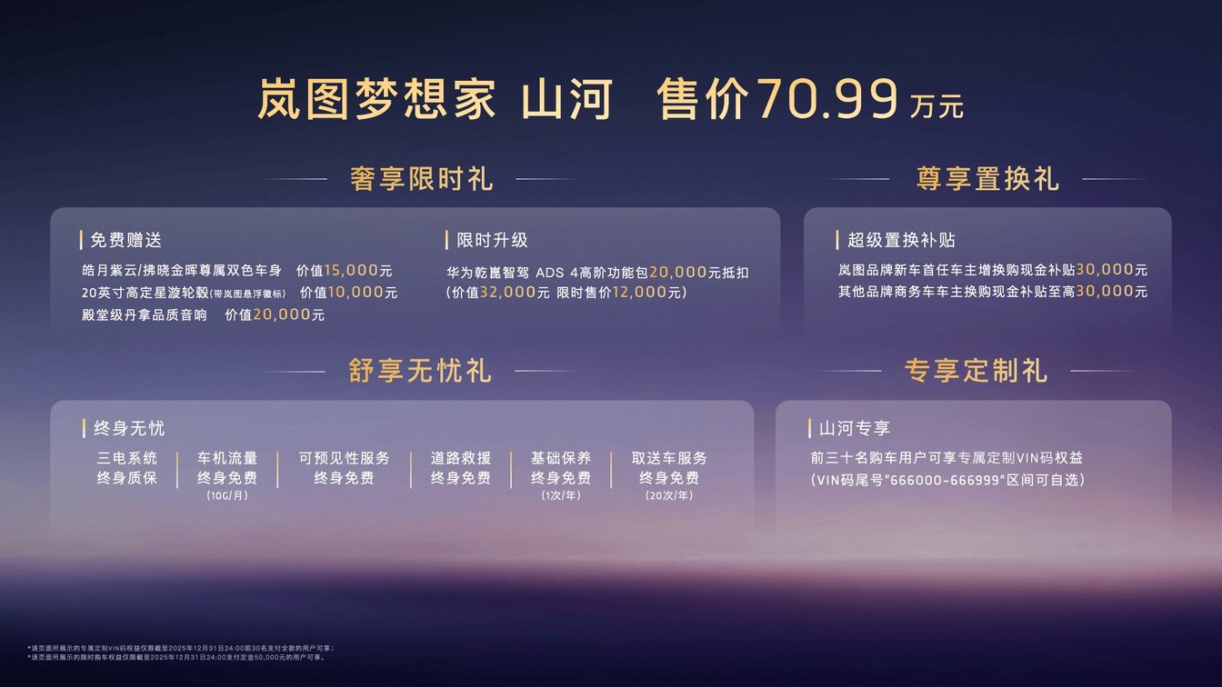 【2025年11月21日 广州】11月21日,广州车展盛大启幕,“新时代旗舰四座MPV”岚图梦想家山河正式上市,售价70.99万元。同步推出山河专属四重礼,包含皓月紫云/拂晓金辉尊属双色车身、20英寸高定星漩轮毂(带岚图悬浮徽标),及殿堂级丹拿品质音响;华为乾崑智驾ADS 4高阶功能包现金抵扣;超级置换补贴;专属定制VIN码权益;三电系统终身质保、车机流量终身免费、道路救援终身免费等权益。