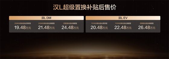 此次,汉L EV 3款车型,超级置换补贴后售价20.48万~26.48万元;汉L DM 3款车型,超级置换补贴后售价19.48万~24.48万元;唐L EV 3款车型,超级置换补贴后售价22.48万~27.48万元;唐L DM 3款车型,超级置换补贴后售价21.48万~27.08万元。同时,比亚迪还为用户准备了包含置换补贴在内的至高价值5.2万元(汉L)/4.5万元(唐L)尊享礼遇。(以上权益截至12月31日)