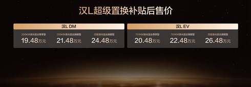 此次,汉L EV 3款车型,超级置换补贴后售价20.48万~26.48万元;汉L DM 3款车型,超级置换补贴后售价19.48万~24.48万元;唐L EV 3款车型,超级置换补贴后售价22.48万~27.48万元;唐L DM 3款车型,超级置换补贴后售价21.48万~27.08万元。同时,比亚迪还为用户准备了包含置换补贴在内的至高价值5.2万元(汉L)/4.5万元(唐L)尊享礼遇。(以上权益截至12月31日)
