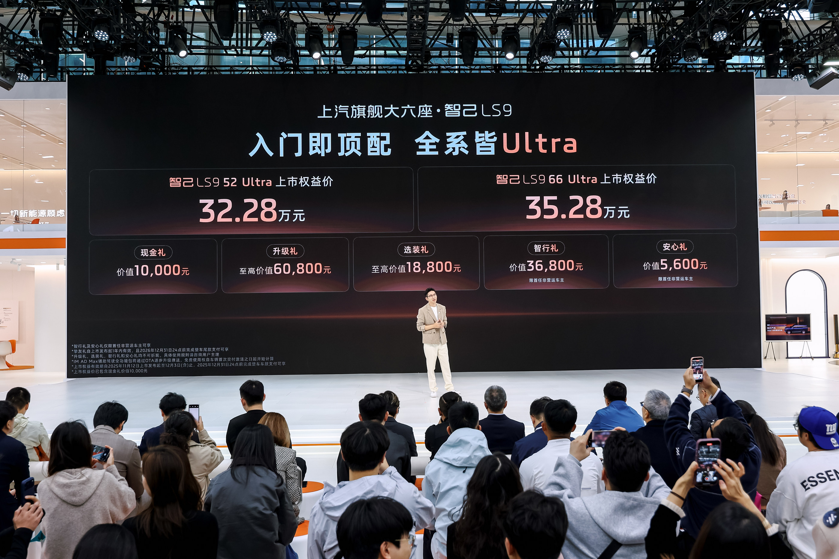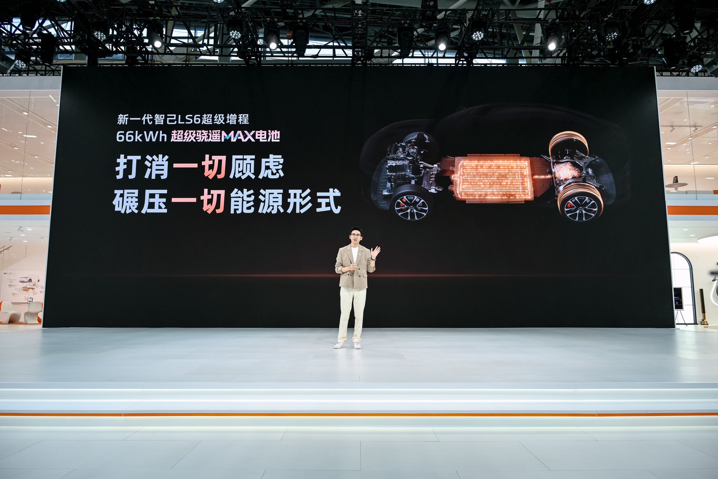 同台的新一代智己LS6,以19.79万起的权益价面向家用用户。它是今年唯一的800V大电池大五座超级增程SUV,首搭“恒星超级增程”技术,开创新能源新品类(是增程,更是自带超充桩的电车)。最受欢迎的66度超级骁遥MAX电池版本,配备宁德时代66度超级骁遥MAX电池,CLTC纯电续航达450km,综合续航超1500km,配合800V超快充,彻底告别续航和补能焦虑;而且它攻克了传统增程车型“亏电状态下动力衰减与噪音大”的行业痛点,1500km全程提供顶级电车的澎湃动力和静谧体验,百公里油电综合能耗仅2.07L,是无家充桩用户、北方用户、燃油车用户的“新能源首选”。