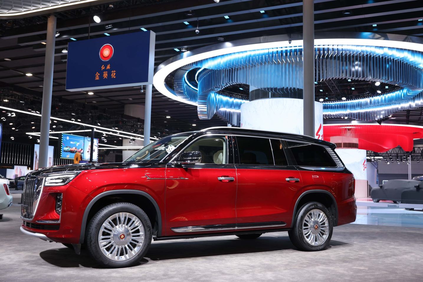 展台的焕新是红旗金葵花本次参展的第一道高光。金葵花将品牌焕新后的VI体系与经典金葵花Logo深度融入空间叙事,金葵红与华耀金的色彩交织,暗合“天人合一”的东方哲学,既有国车六十余年积淀的庄重底蕴,又不乏超豪华品牌应有的精神气度。