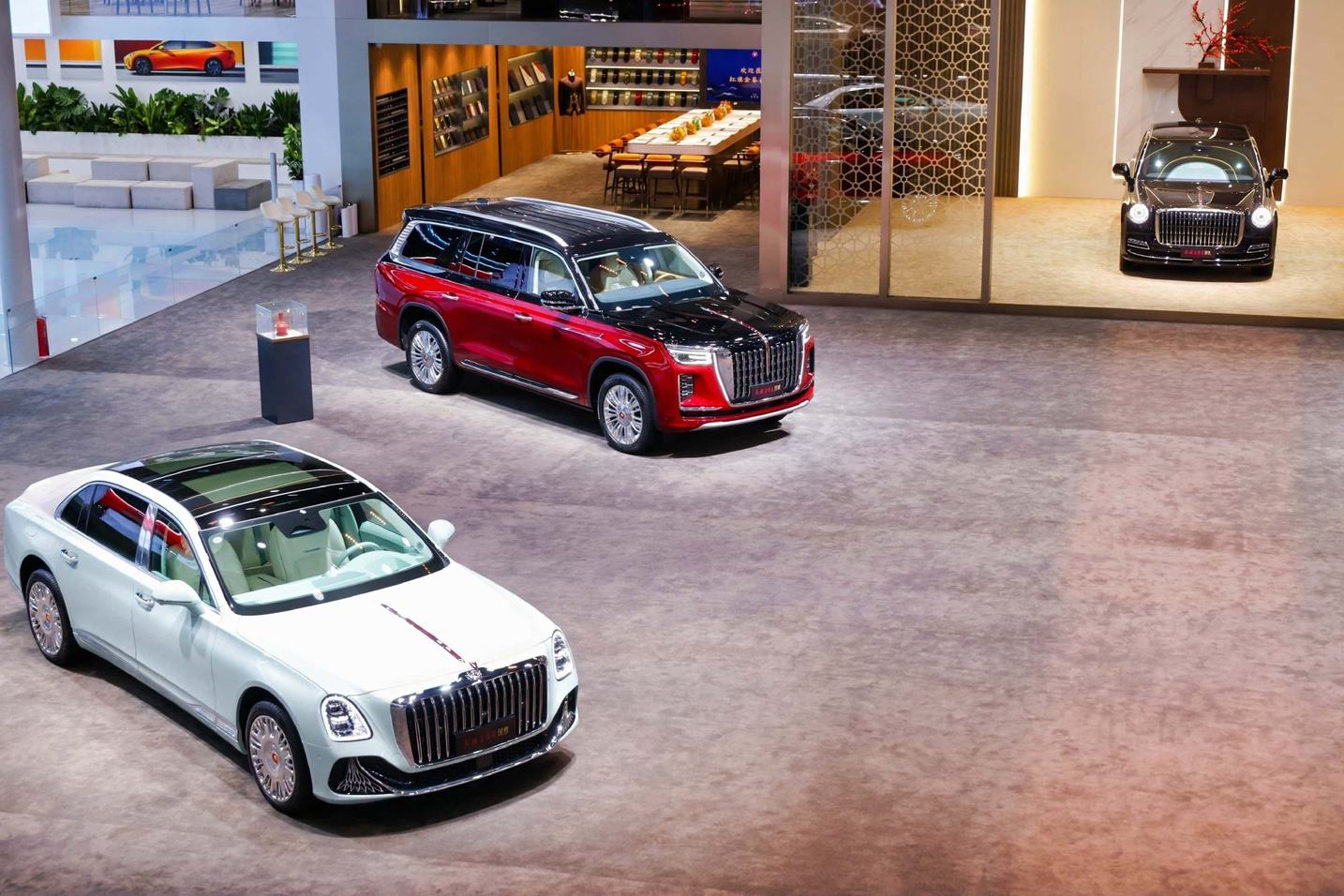本次车展的核心焦点,无疑是国礼、国雅、国耀、国悦组成的国宾车队集体亮相,四款车型各展所长,共同勾勒出红旗金葵花覆盖全场景的超豪华产品矩阵。作为全场最受瞩目的明星车型,国礼“丹霞”主题定制版完成全球首发,以广东韶关丹霞山为灵感源泉,将“色如渥丹,灿若明霞”的地貌奇观,通过大漆、刺绣等非遗工艺沉淀于座舱细节。四门门饰板上的漆画,历经非遗匠人55道工序手工制作,每一寸肌理都凝聚着千年技艺的温度;自主研发的4.0L V8双涡轮增压发动机,搭配适时四驱系统,让这款定价718万元起的顶级旗舰,既有艺术品的收藏价值,又有顶级豪车的澎湃性能。更值得称道的是,其提供的数十万种定制组合与15种设计师推荐款式,让每一台国礼都成为独一无二的文化载体。