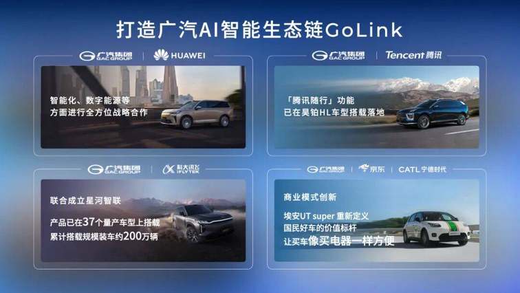 在生态协同领域,此次车展,广汽GoLink生态链首发亮相。这并非简单的资源整合,而是一场关于产业未来的精准布局。向上,广汽与华为合作攻坚智能化的天花板。向内,与腾讯打磨座舱生态(腾讯随行上车)。面向年轻消费者,广汽与京东共创渠道新模式,让买车像买电器一样简单。