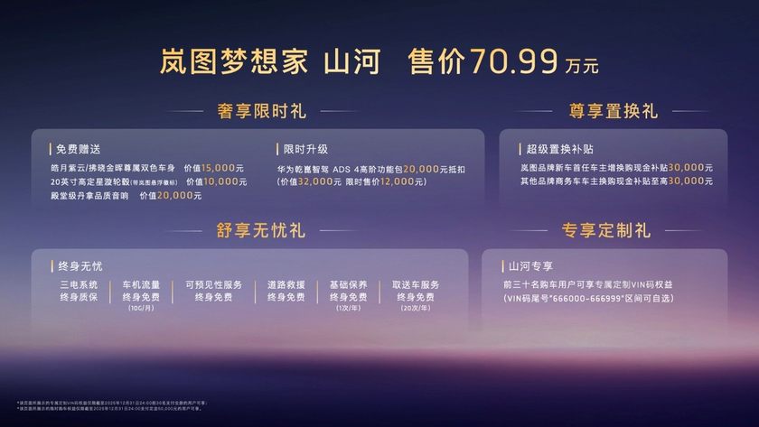 11月21日,广州车展盛大启幕,“新时代旗舰四座MPV”岚图梦想家山河正式上市,售价70.99万元。同步推出山河专属四重礼,包含皓月紫云/拂晓金辉尊属双色车身、20英寸高定星漩轮毂(带岚图悬浮徽标),及殿堂级丹拿品质音响;华为乾崑智驾ADS 4高阶功能包现金抵扣;超级置换补贴;专属定制VIN码权益;三电系统终身质保、车机流量终身免费、道路救援终身免费等权益。