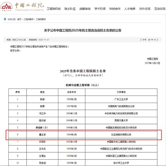 2025年11月21日,中国工程院公布了2025年院士增选结果。比亚迪集团首席科学家、汽车总工程师、汽车工程研究院院长廉玉波以技立身荣膺院士当选中国工程院院士。